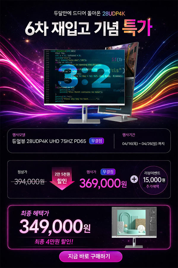 4월 16일 목요일부터 26일 일요일까지 11일간 네이버 스마트스토어 단독으로 진행되는 이번 행사는 394,000원에 판매되는 무결점 모델을 25,000원 할인된 369,000원에 판매한다.