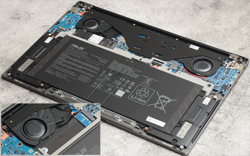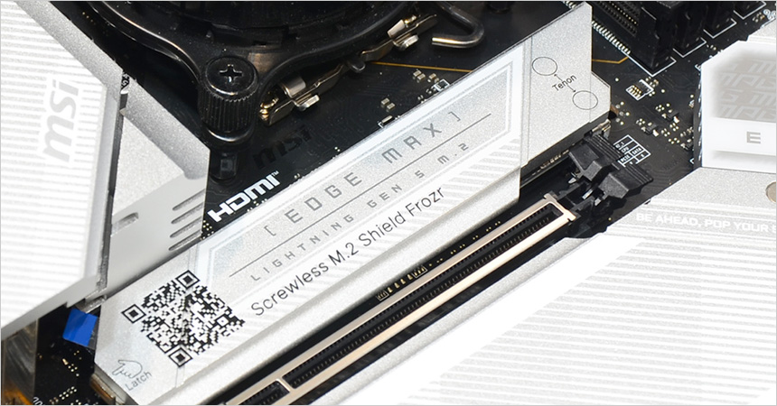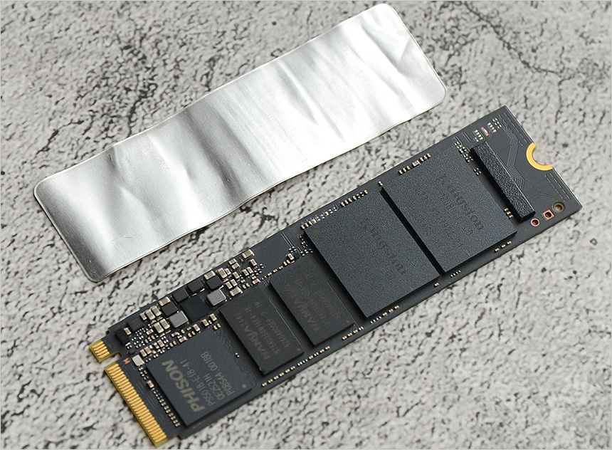 SSD 내부의 모습으로 종이나 얇은 필름 형태의 포장지를 사용하는 일반 SSD와 달리 컨트롤러와 DRAM, 낸드 플래시의 열을 효과적으로 식혀주기 위해 로우 프로파일 알루미늄 히트 스프레더가 부착된 것을 확인할 수 있다. (히트싱크 수준은 아니지만 발열 제어 효과는 탁월하다.)