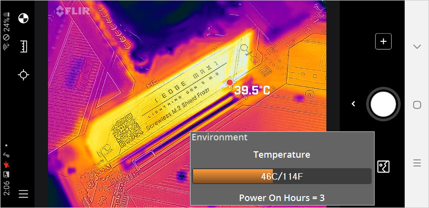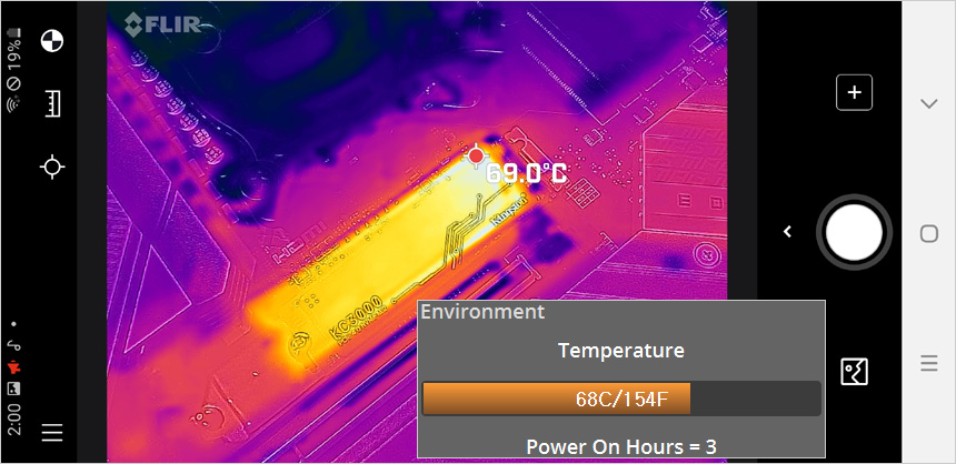 크리스탈 디스크마크의 읽기/쓰기를 2회 진행하고 3번째 실행에서 (실내온도 16도) 열화상 카메라로 SSD 온도를 확인하고 있는 모습으로 컨트롤러의 온도가 70도 까지 올라가는 것을 확인할 수 있었다. (히트 스프레더 때문인지 과도 하게 온도가 올라가지 않았다.) SSD 사용율 100% 에 육박하는 테스트로 일상적인 PC사용시 에는 더 낮은 온도로 작동한다. 이점 참조 바란다.