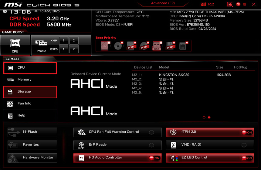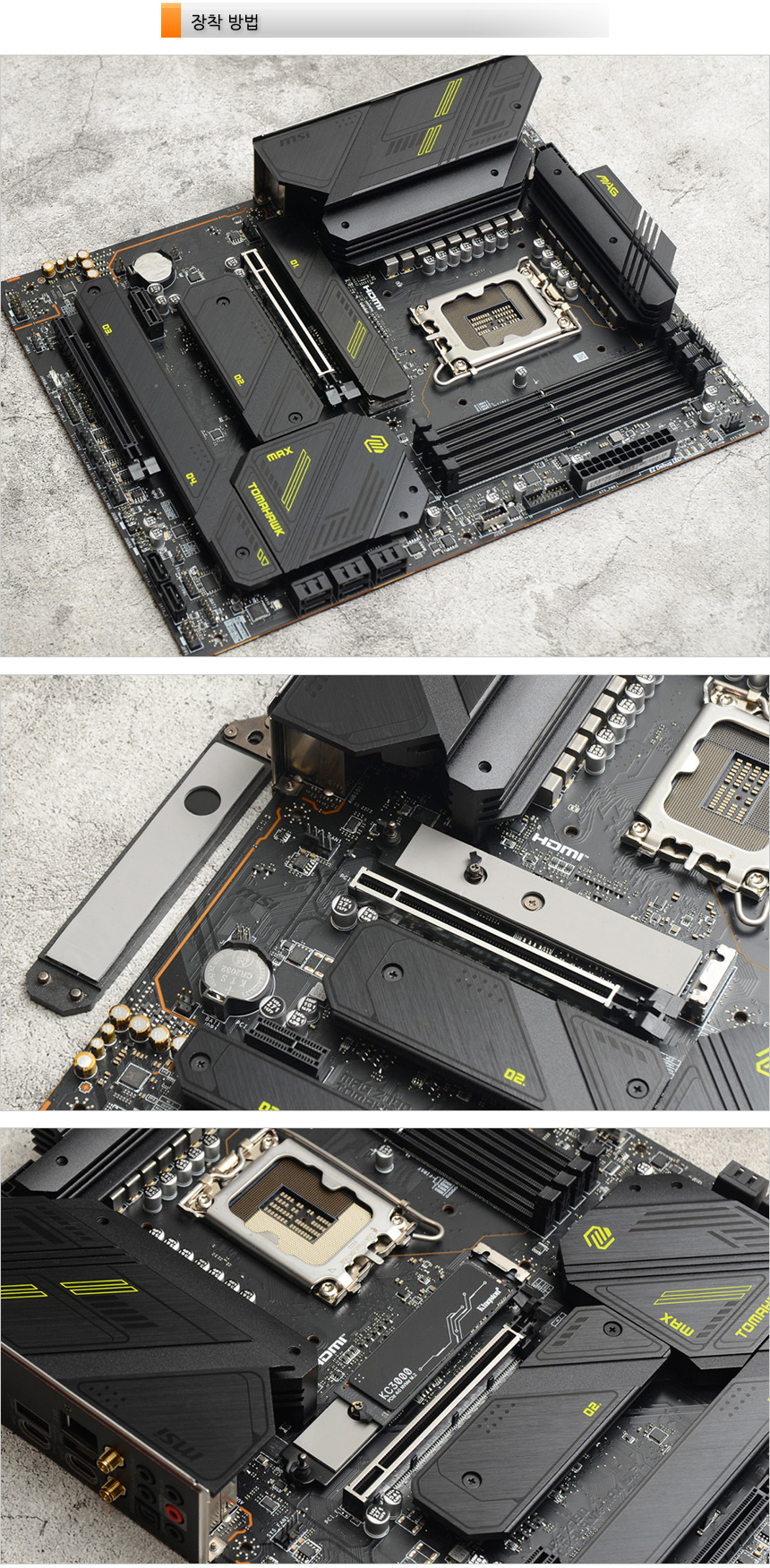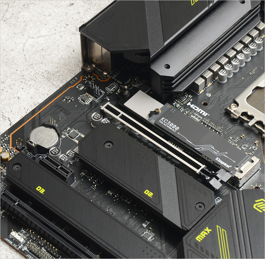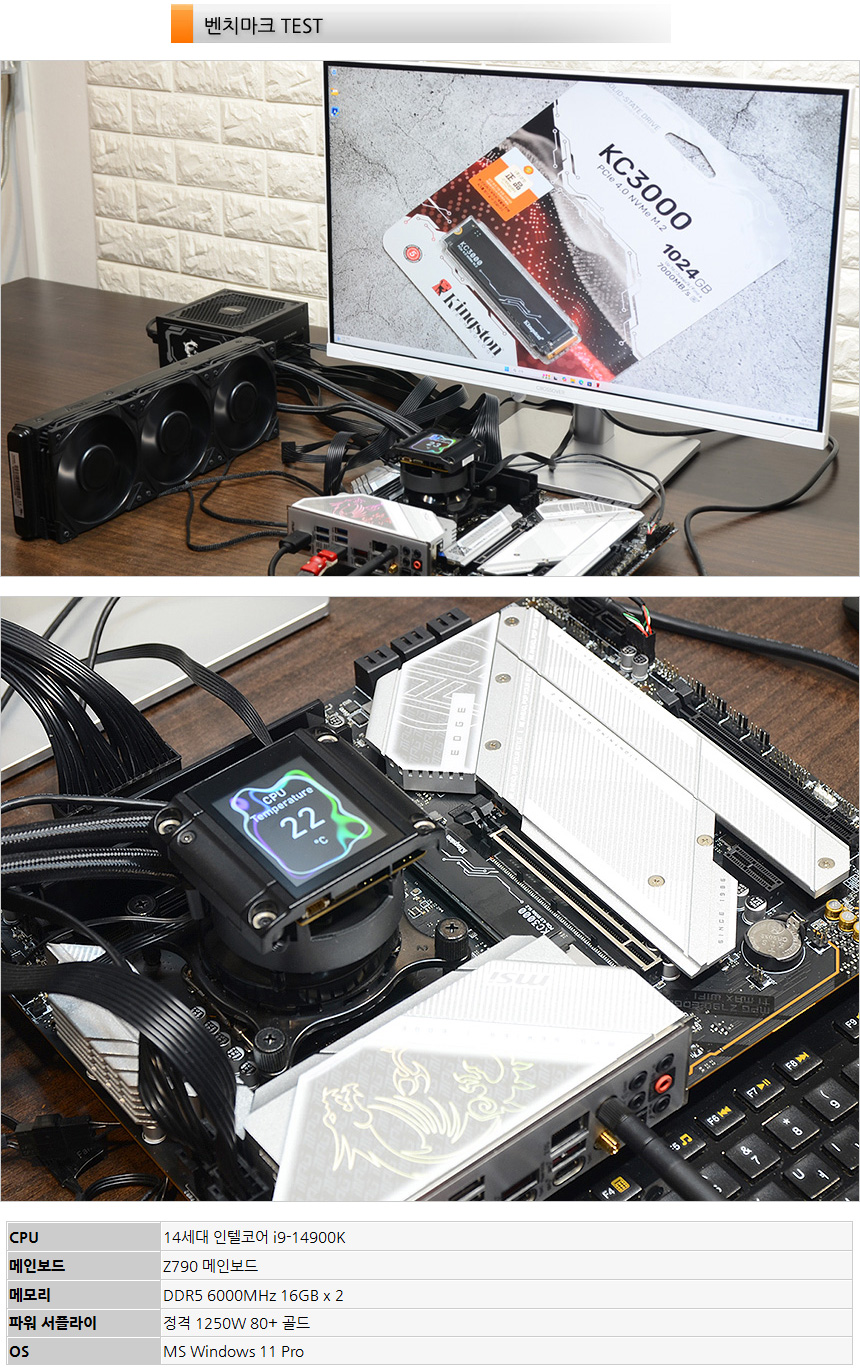 테스트 시스템의 모습으로 PCIe Gen4를 지원하는 Z790 칩셋 기반의 메인보드를 사용했으며 32GB DDR5 6000MHz 듀얼채널 메모리와 1250W 파워 등을 이용해 테스트를 진행했다. (그래픽 카드가 SSD 성능에 영향을 주지 않아 내장 그래픽을 사용했다.) @ 테스트는 OS를 설치하는 메인 SSD 형태로 진행했으며 메인보드 방열판을 사용했다.