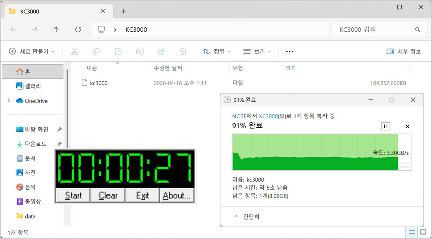 100GB 더미파일을 만든 후 파일 전송 속도 테스트를 진행하고 있는 모습으로 3.3GB/s 정도의 빠른 속도를 보여 주었다. (시간은 27초가 소요되었다.) @ 참고로 보급형 SSD는 50초 이상의 시간을 기록한 테스트 였다.