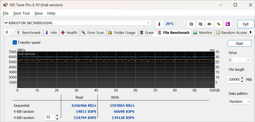 HD Tune를 이용해 대용량 파일 전송시 속도저하가 발생하는지 여부를 확인하고 있는 모습으로 100GB 용량에서 테스트를 진행했을 때 특정 구간에서 급격하게 속도가 떨어지지 않고 균일한 속도를 보여주었다. 이 제품은 디램이 기본 탑재되어 있어 데이터의 빠른 액세스가 가능할 뿐만 아니라 속도 저하 없이 대용량 데이터를 전송할 수 있다.