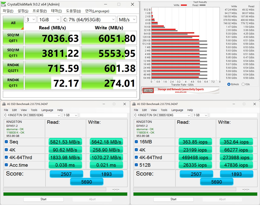 벤치마크 테스트를 진행한 모습으로 크리스탈 디스크마크 에서 읽기와 쓰기 속도가 스펙 보다 높은 것을 확인할 수 있었다. 쓰기 속도가 현저히 느린 보급형 모델들과 달리 쓰기 속도도 대단히 빠를 뿐만 아니라 AS SSD의 스코어도 높은 것이 눈에 띈다.