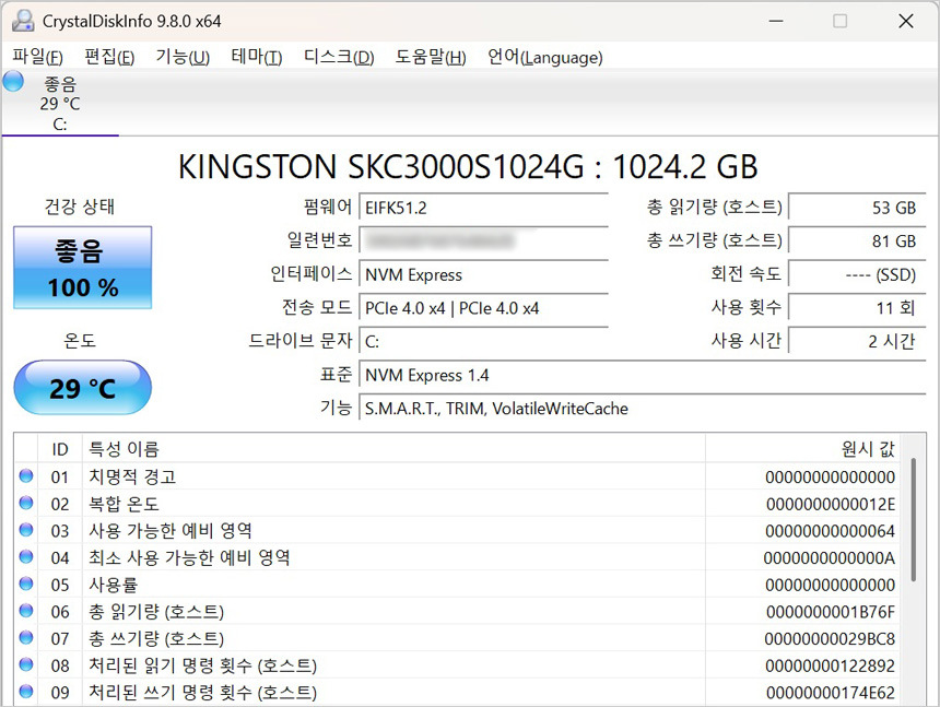 시스템 정보를 확인하고 있는 모습으로 바이오스에서 정상적으로 제품이 인식되는 것을 알 수 있으며 크리스탈 디스크인포 에서 PCIe 4.0 인터페이스 지원 제품이라는 것을 확인할 수 있다.