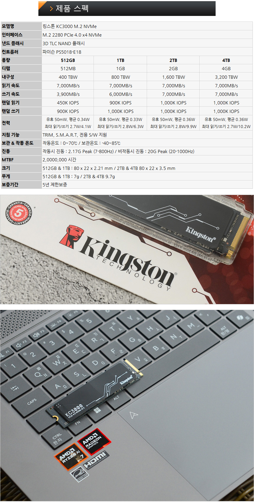 리뷰를 진행하는 킹스톤 KC3000 M.2 NVMe는 코잇 에서 유통 및 A/S를 진행하고 있다. 직구 제품의 경우 국내에서 A/S가 불가한 데 반해 스티커가 동봉된 정품의 경우 정식 A/S 가능하며 5년의 넉넉한 기간을 지원해 문제가 발생했을 때 빠르게 조치를 받을 수 있다. (5년의 넉넉한 A/S 기간을 생각한다면 코잇 에서 유통하는 정품 구입을 추천한다.)