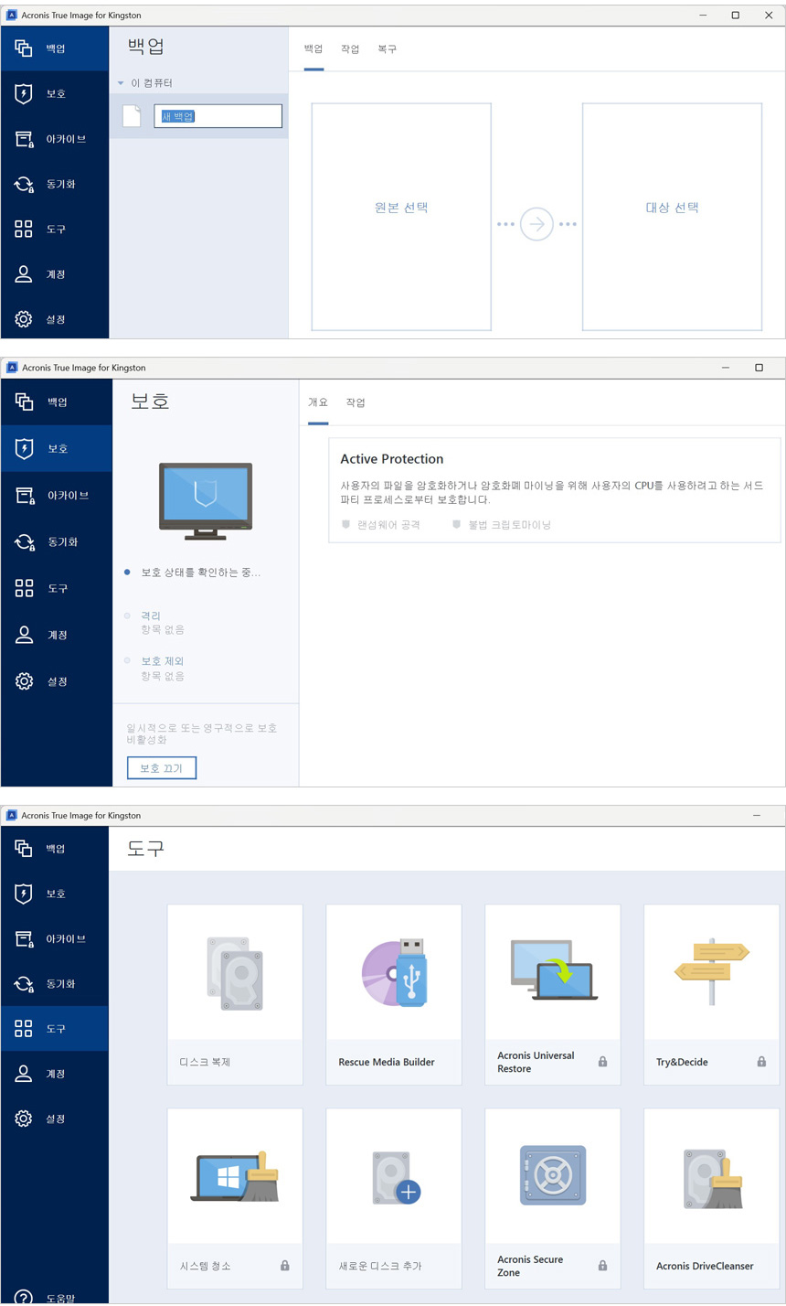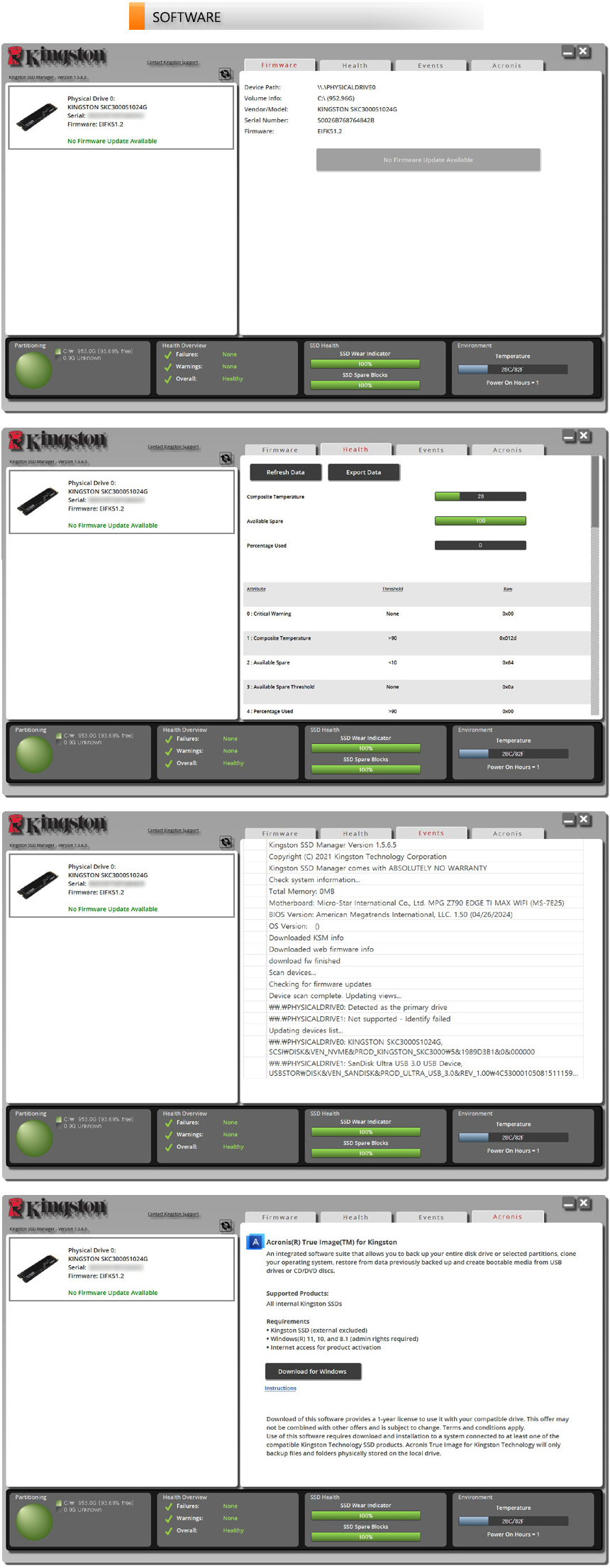 킹스톤 홈페이지에서 전용 S/W를 제공해 모니터링이 가능하며 드라이브 이벤트 상황을 한눈에 파악할 수 있다. 또한 펌웨어 업데이트를 통해 최상의 컨디션으로 SSD를 사용할 수 있으며 아크로니스 트루이미지 1년 무료 구독권을 제공해 백업과 복원 등을 간편하게 실행할 수 있다.