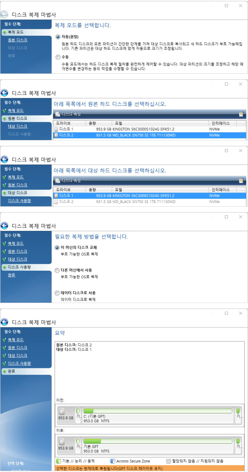 PC나 노트북의 SSD를 교체할 경우 새로 OS와 드라이버, S/W등을 설치해야 하는데 번거롭기도 하고 시간도 많이 소요된다. 이 때 디스크 복제 기능을 사용하면 빠른 시간에 셋팅을 마무리 할 수 있다. 상단의 사진은 디스크 복제를 실행한 모습으로 원본 (기존 SSD)와 대상 (킹스톤 KC3000) SSD를 선택하고 실행 버튼만 누르면 자동으로 디스크를 복제하게 된다.