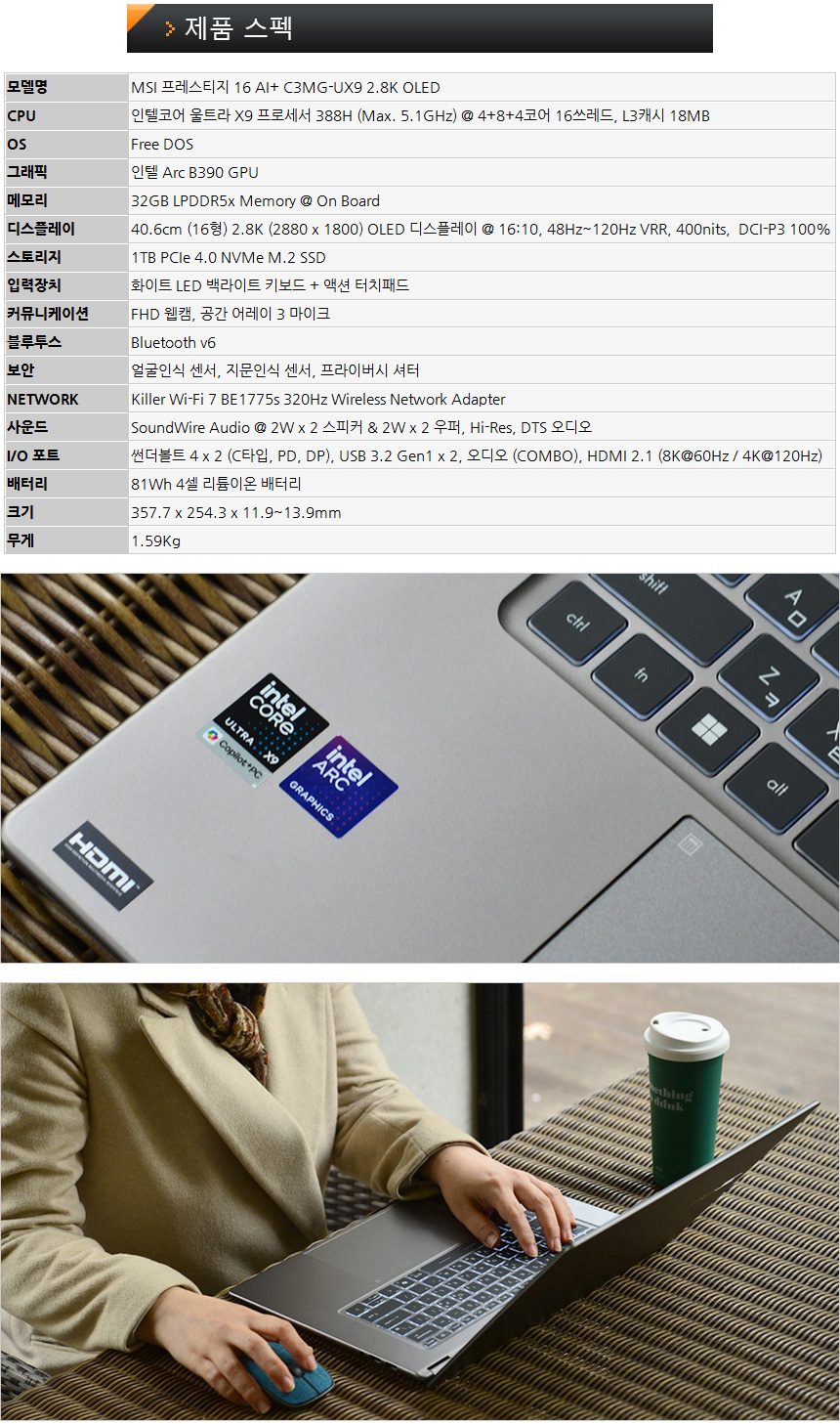 최근 출시된 인텔 팬서레이크 탑재 슬림 노트북중 가장 화려한 스펙을 자랑하는 모델로 성능이나 지원에서도 차별화된 모습을 보여주리라 예측된다. 리뷰를 통해 디자인 및 특징을 살펴보고 다양한 테스트를 통해 성능을 확인해 보도록 하자. @ MSI 프레스티지 16 AI+ C3MG-UX9 2.8K OLED 는 4월 21일 현재 1차 입고 물량이 완판 되었으며 2차 물량입고가 진행중이다. 이점 참조하기 바란다.