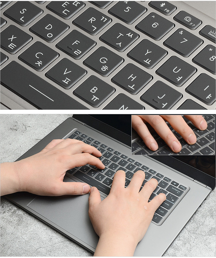 타이핑 테스트를 진행하고 있는 모습으로 대화면 노트북 특유의 넓은 키 간격으로 오타 없이 고속 타이핑이 가능했다. 키압은 낮은 편이며 긴 트래블과 높은 탄력으로 손가락의 부담 없이 타이핑 할 수 있었으며 팜래스트가 손을 완전히 받쳐주어 손이나 손목 등의 피로감이 크지 않았다. 장시간 타이핑 작업으로 해야 하는 직장인이나 대학생이 편하게 사용할 수 있을 것이다.