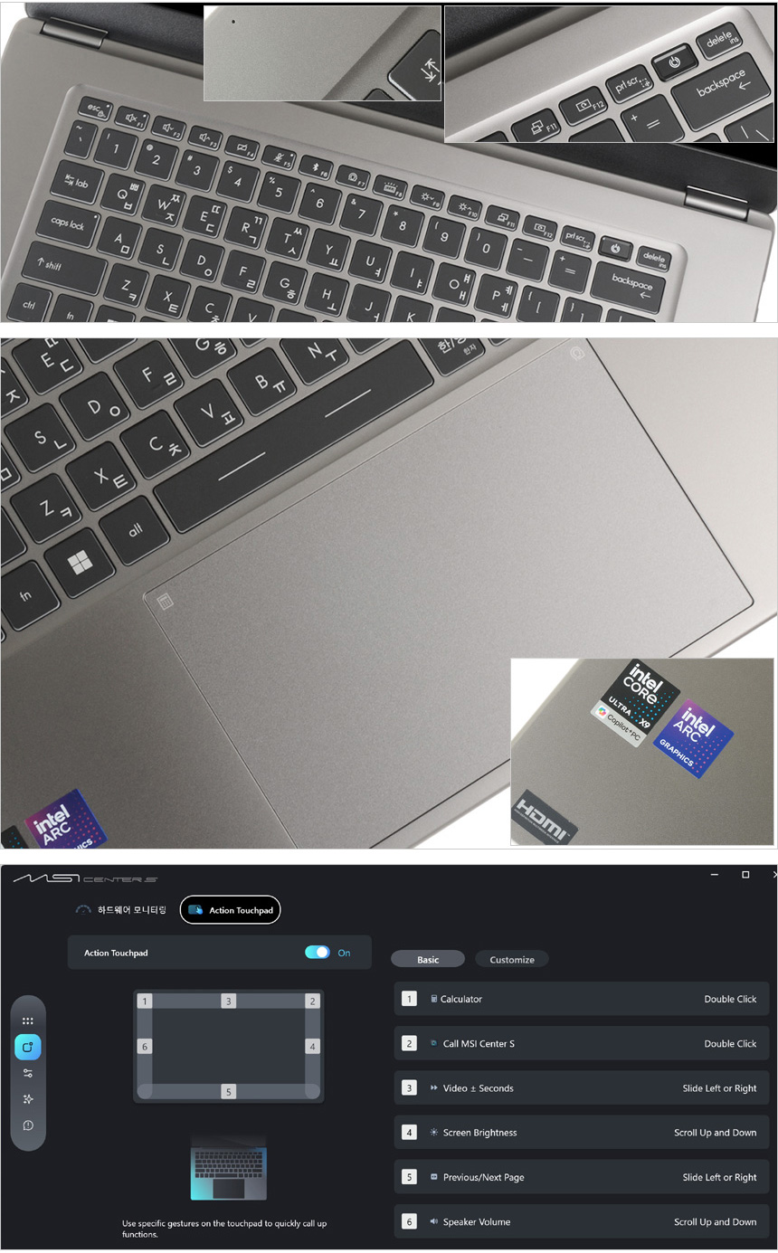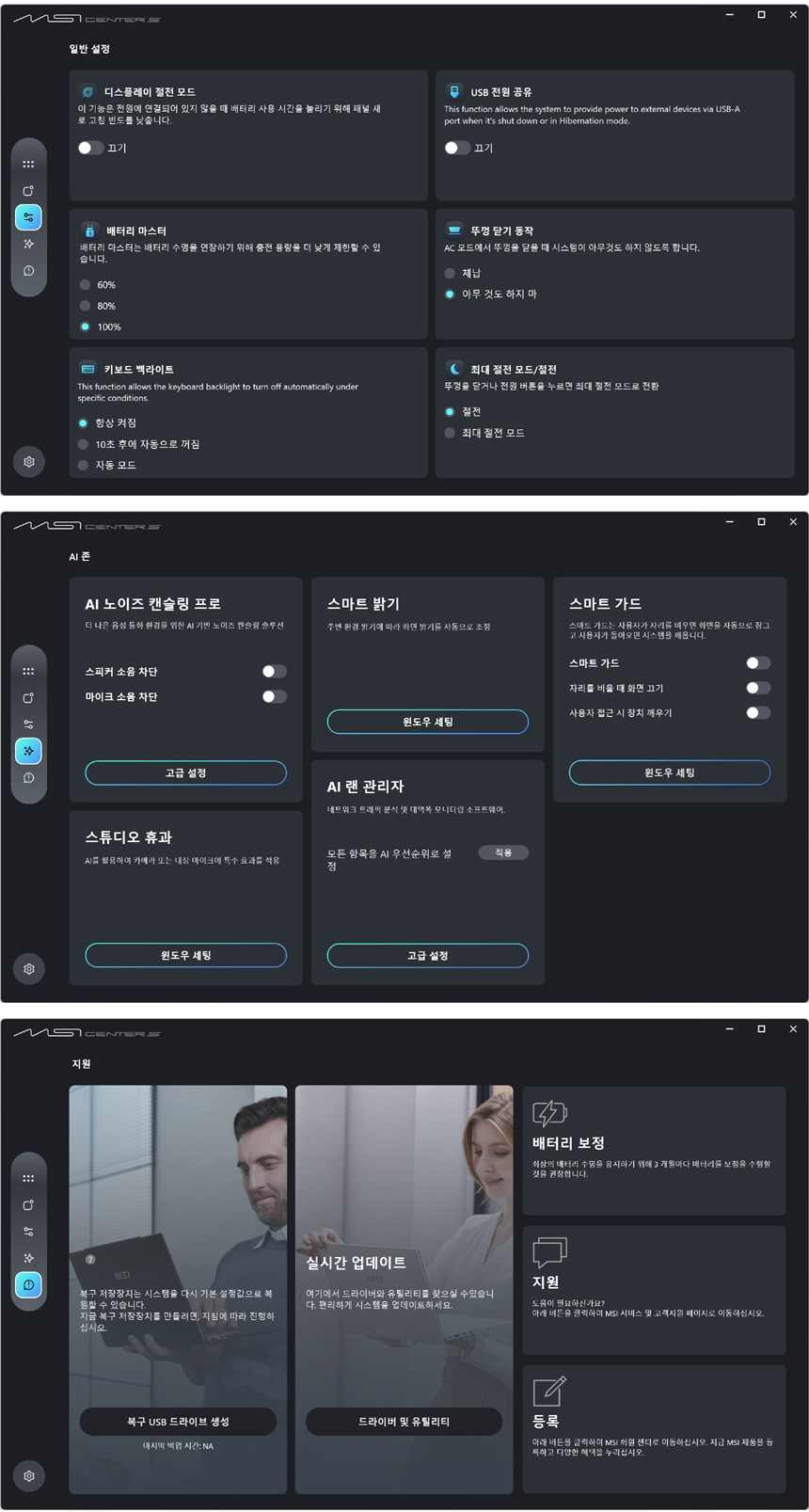 전용 S/W인 MSI 센터S 의 모습으로 메인화면에서 퍼포먼스와 디스플레이 컬러 설정이 가능하며 AI 엔진 세부설정에서 지원 기능과 배터리 상태 등을 선택할 수 있다. 또한 시스템 모니터링이 가능하며 상단에 확인한 액션 터치패드 설정도 지원한다.