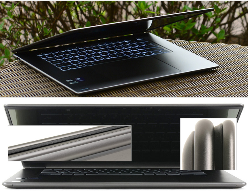 노트북 후면부의 모습을 뜨거워진 내부 공기가 빠져나오도록 통풍구가 설치된 것을 확인할 수 있다. 참고로 이 제품은 휴대성에 특화된 모델임에도 듀얼팬을 적용했으며 넓은 방열 면적으로 효율성을 높인 베이퍼 챔버 쿨러와 내부 공기 흐름을 최적화 한 인트라 플로우 설계로 소음을 최소화 하는 동시에 온도를 효과적으로 낮춰준다.