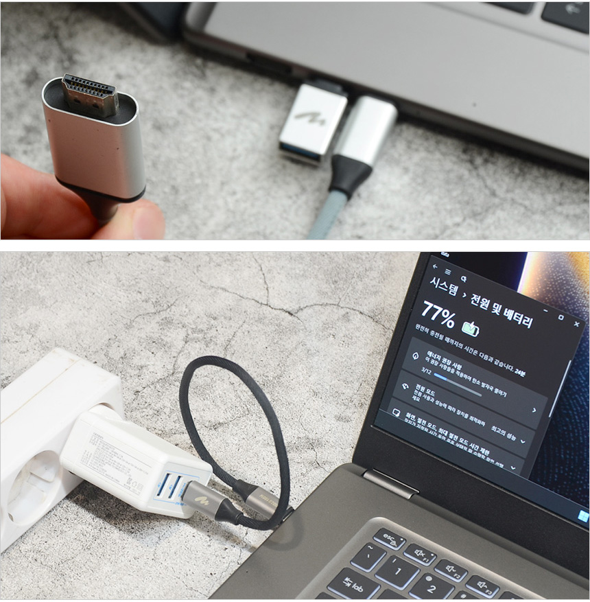 썬더볼트 4 단자는 빠른 데이터 전송이 가능하며 젠더를 사용하면 A타입의 일반 주변기기도 연결할 수 있다. 또한 디스플레이 출력 지원으로 모니터 연결이 가능하며 PD 충전도 가능해 시중에서 쉽게 구입할 수 있는 PD충전기를 이용해 전원을 공급할 수 있다.