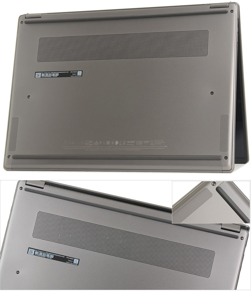 노트북 바닥면의 모습으로 칩셋이 설치된 상단에 통풍구가 설치된 것을 확인할 수 있으며 상단과 하단에 고무패드가 장착되어 미끄러짐을 방지한다. 또한 하단 양 측면에는 스피커가 설치되어 퀄리티 높은 사운드를 즐길 수 있다.