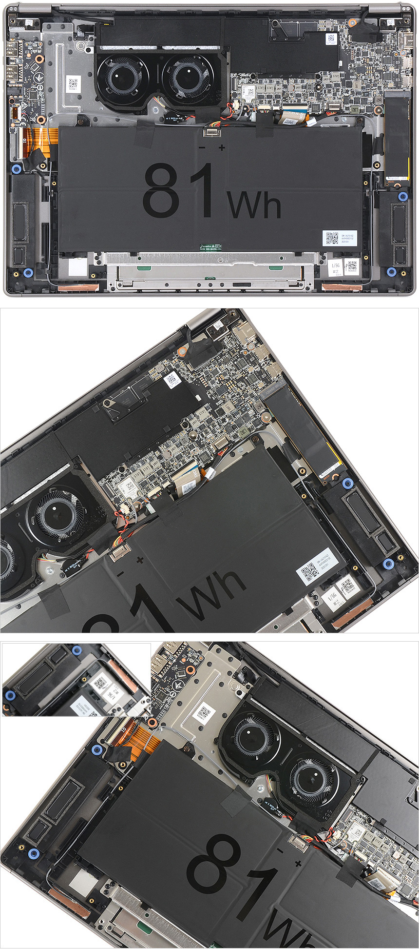 내부의 모습으로 상단에는 CPU와 전원부의 열을 식혀주기 위해 듀얼팬이 장착되어 있으며 하단에는 81Wh 대용량 리튬이온 배터리를 비롯해 스피커와 무선랜 안테나 등이 설치된 것을 확인할 수 있다. (2개의 유닛을 지원하는 일반 노트북과 달리 2개의 우퍼를 포함한 4개의 유닛을 지원한다.)