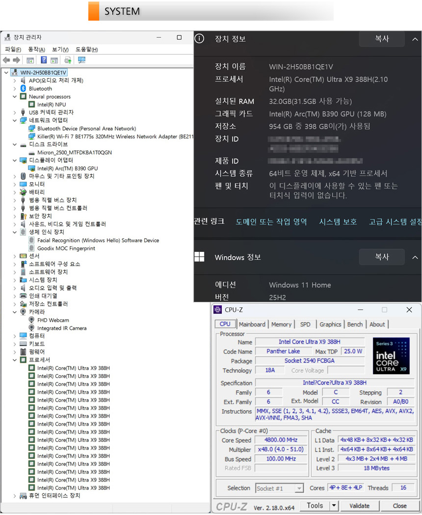시스템 정보를 확인하고 있는 모습으로 4P+8E+4LP 코어에 24MB+18MB 캐시를 지원하는 인텔코어 울트라 X9 388H 프로세서가 탑재된 것을 확인할 수 있다. 인텔 18A 공정으로 설계된 팬서레이크중 최상급 프로세서로 기존 모바일 프로세서나 하위 모델과 확연히 비교되는 강력한 성능을 경험할 수 있으며 아크 B390 GPU가 탑재되어 게임도 부드럽게 즐길 수 있다.