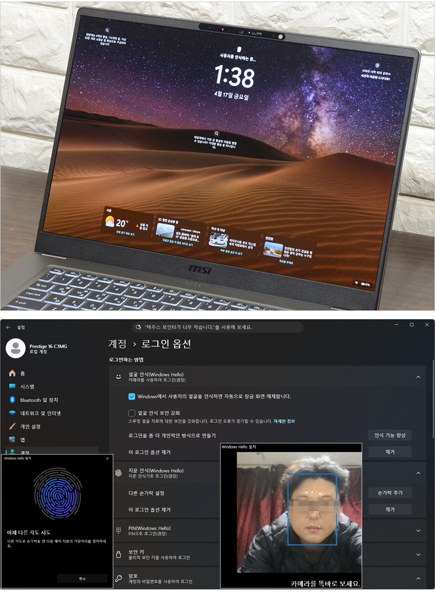 비즈니스 용도로 활용할 수 있는 프리미엄 슬림 노트북 답게 다양한 물리보안 기술을 지원한다. 디자인 부분에서 확인했던 프라이버시 셔터 뿐만 아니라 지문인식 센서와 얼굴인식을 위한 IR 카메라가 장착되어 다양한 장소에서 걱정없이 사용할 수 있다. (윈도우즈 헬로에서 얼굴과 지문 등록이 가능하다.)