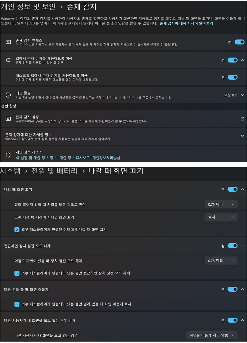 사용자가 자리를 비우면 화면이 자동으로 꺼지며 다시 자리로 오면 절전 모드가 해제되어 보안성과 편의성을 한층 높일 수 있는 인체감지 기술이 적용되어 있다. @ 이 기능은 얼굴인식과 함께 사용하는 것을 적극 권장한다. 인체감지 설정은 설정->개인정보 및 보안->존재감지->존재감지 설정에서 셋팅할 수 있다. (동영상을 확인하기 바란다. 어떻게 동작하는지 쉽게 이해할 수 있을 것이다.)