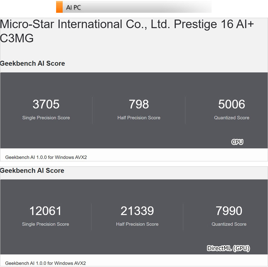 AI 전용 벤치마크 툴을 이용해 AI 성능 테스트를 진행하고 있는 모습으로 인텔 아크 B390 내장그래픽을 지원하는 최상급 CPU 탑재 모델답게 스코어가 대단히 높은 것을 확인할 수 있었다. (GPU 스코어는 보급형 노트북을 압도하는 수준이다.)