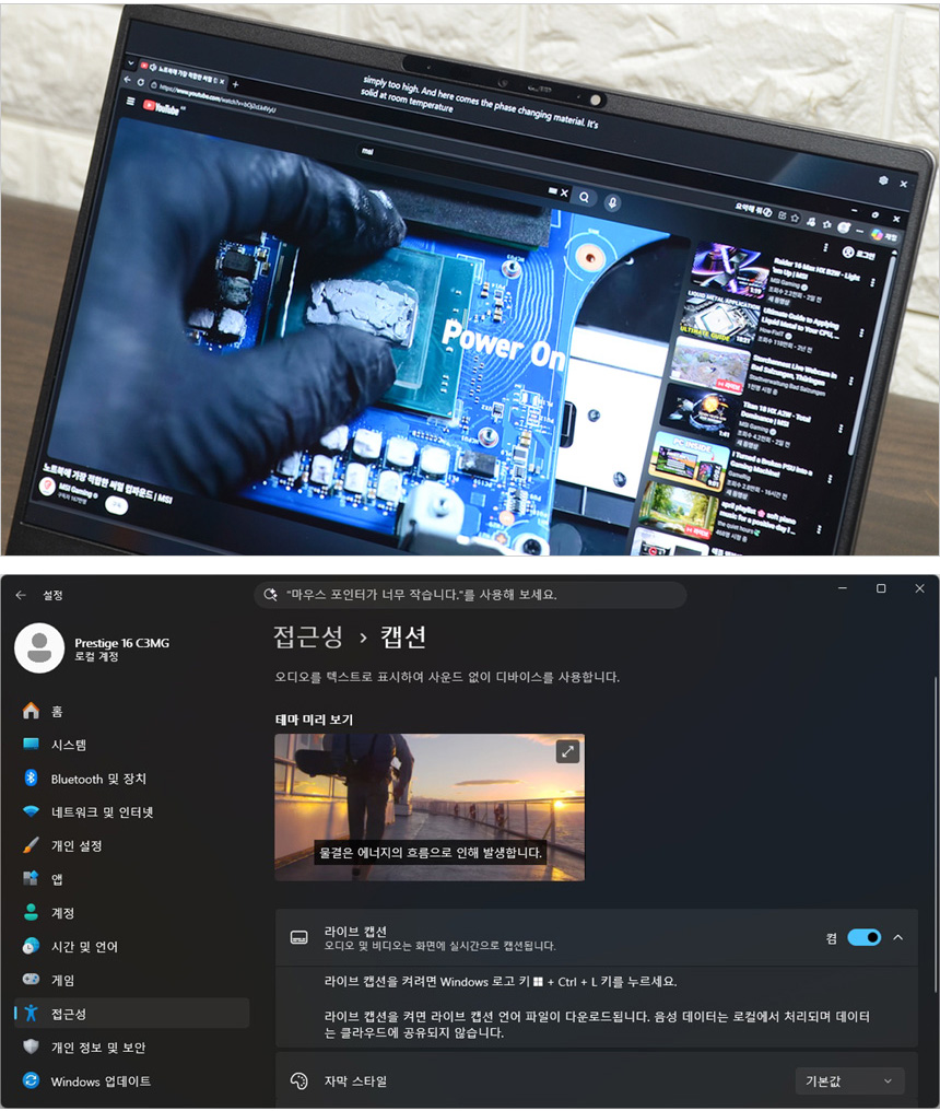 4K 동영상을 이용해 멀티미디어 테스트를 진행하고 있는 모습으로 16형 대화면에 QHD+ 해상도의 OLED 패널을 탑재해 선명한 영상을 즐길 수 있었으며 (진한 블랙 표현이 특히 마음에 들었다.) 사운드 퀄리티도 뛰어나 높은 몰입감을 경험할 수 있었다. 또한 MP3 파일을 이용해 스피커 사운드 테스트를 진행했는데 4개의 유닛을 지원하는 모델답게 게이밍 노트북 못지 않은 높은 출력은 물론 밀도감 높은 단단한 사운드를 들려주어 귀가 아주 즐거웠다.
