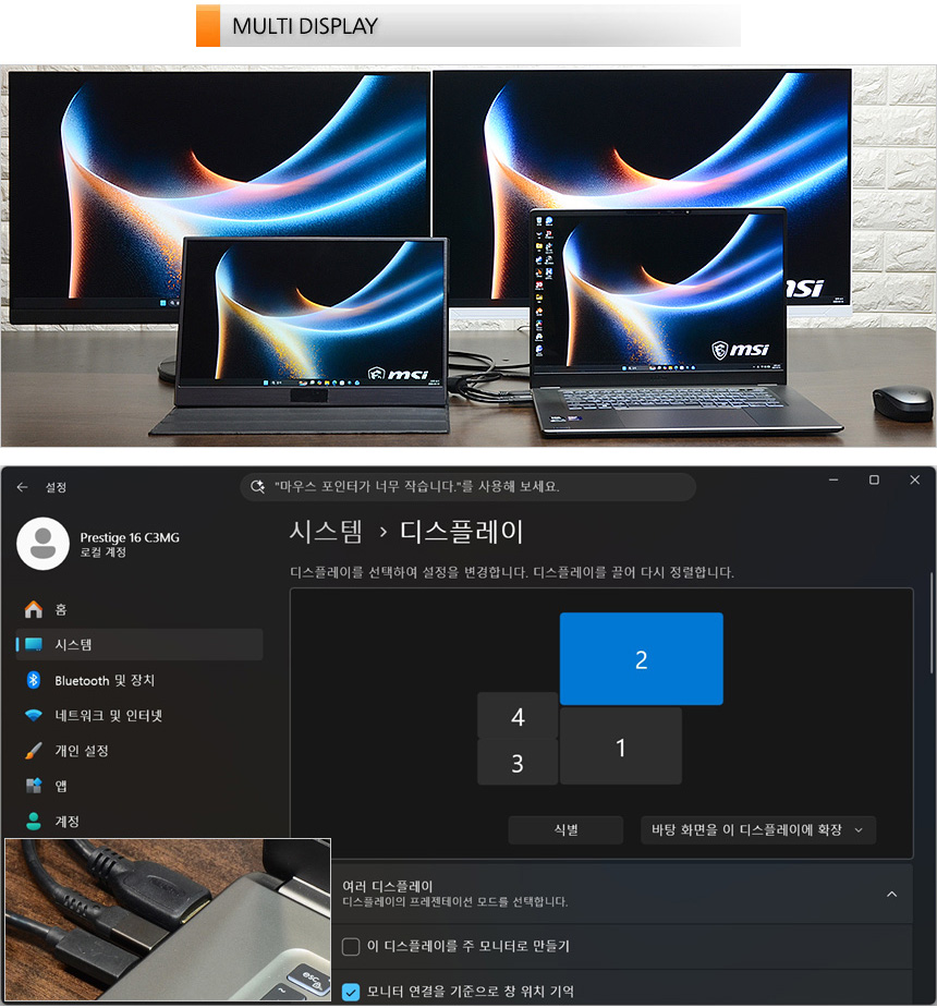 2개의 썬더볼트 4 단자가 디스플레이 출력을 지원해 총 3개의 디스플레이를 연결할 수 있다. 다중화면 사용이 필수적인 직장인이나 크리에이터, 대학생 등이 편하게 노트북을 사용할 수 있을 것이다. 특히 HDMI는 8K@ 60Hz와 4K@120Hz를 지원해 전문가용 모니터를 연결해 디자인 등의 작업용으로 사용할 수 있다.