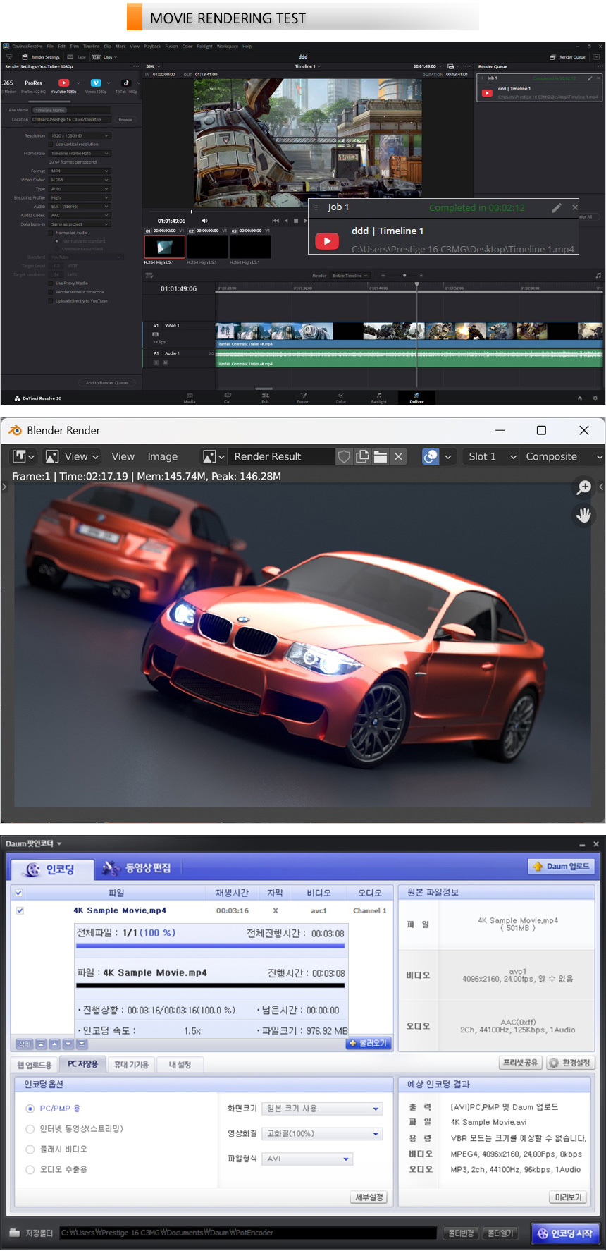 영상편집 S/W 다빈치 리졸브를 이용해 랜더링 테스트를 진행하고 있는 모습으로 (640MB, 920MB, 990MB 4K 동영상을 단일 동영상으로 랜더링, FHD 해상도에 H.264 비디오 코덱) 2분 12초가 소요되는 것을 확인할 수 있었다. 또한 CPU 사용율이 높은 블랜더 랜더링 테스트 에서도 랜더링 시간이 상당히 짧은 것을 확인할 수 있었다. 마지막으로 다음 팟인코더를 이용해 4K 동영상의 인코딩을 진행하고 있는 모습으로 최상급 프로세서가 탑재된 모델답게 3분 8초의 빠른 인코딩 시간을 보여주었다. @ 아크 내장그래픽 모델답게 영상편집 랜더링 시간이 대단히 짧았다.