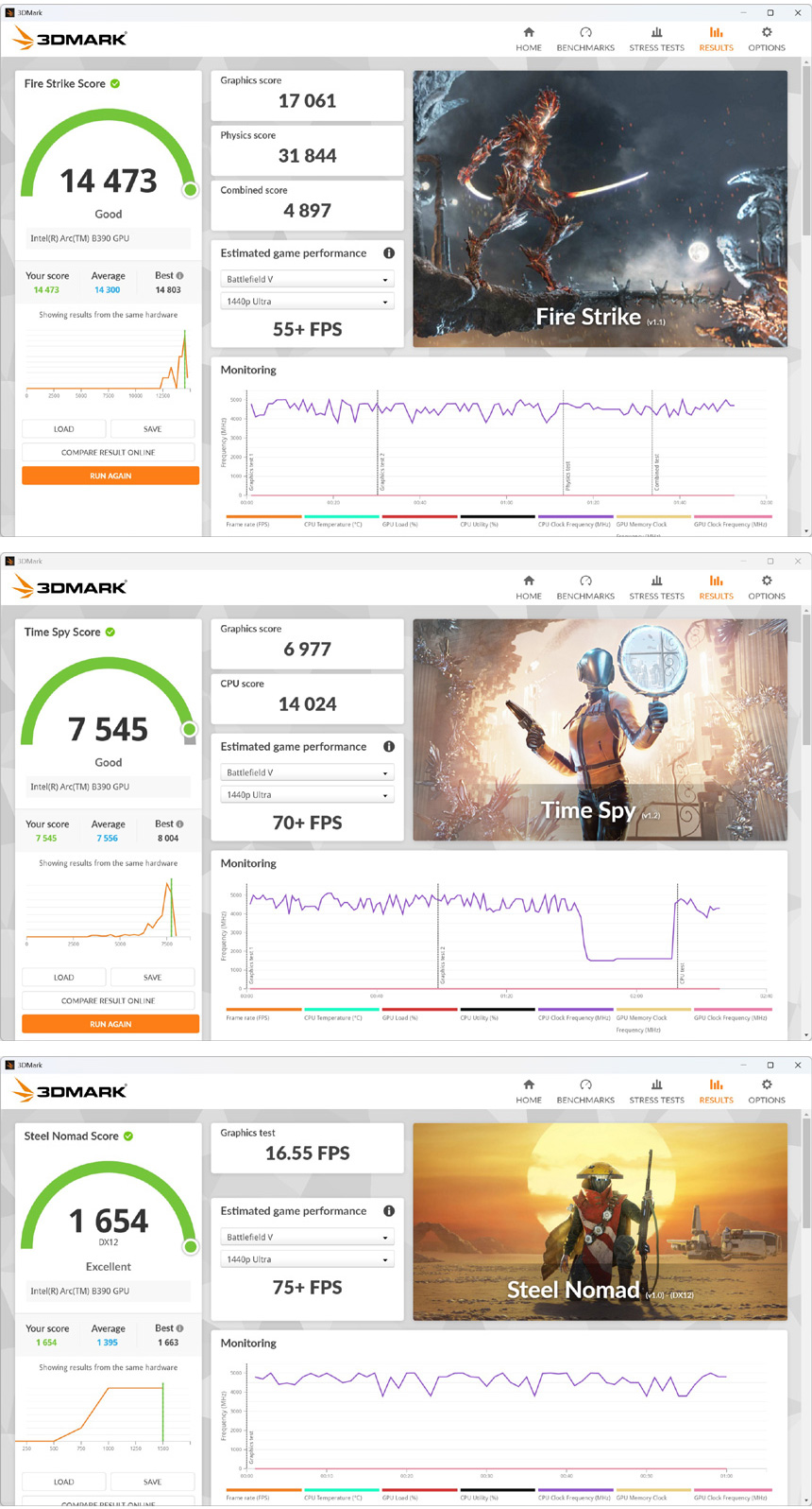 3DMARK를 이용해 외장그래픽의 성능을 확인하고 있는 모습으로 게이밍 용도로 충분히 사용할 수 있는 높은 스코어를 보여주었다. (참고로 RTX 4050 랩탑 GPU와 스코어가 비슷하다. 기존의 내장그래픽과는 확연히 다른 성능을 경험할 수 있을 것이다.)