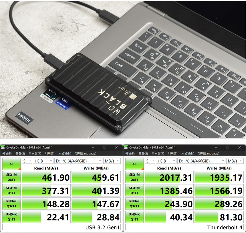 썬더볼트 4 단자를 지원해 빠른 데이터 전송이 가능하다. 상단의 사진은 외장 SSD (USB 3.2 Gen2x2 지원모델) 를 이용해 테스트를 진행하고 있는 모습으로 USB 3.2 Gen1과 확연한 차이를 보여주는 것을 확인할 수 있다.