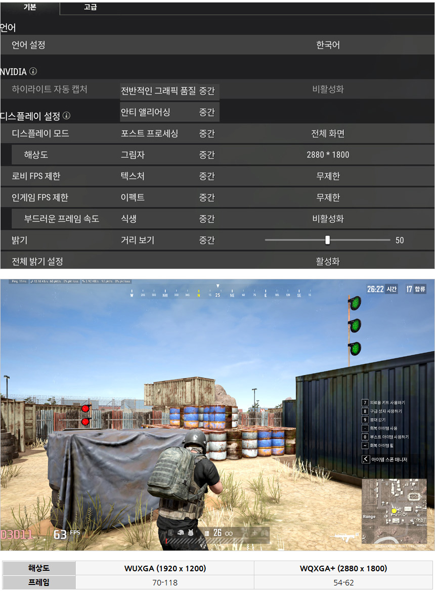 업스케일링을 지원하지 않는 배틀그라운드 (연습장)를 실행한 모습으로 WQXGA+ 해상도에서는 부드러운 움직임을 보여주었다. 단, 좀더 쾌적하게 게임을 플레이 하고 싶다면 WUXGA 해상도로 설정하고 즐기기 바란다.