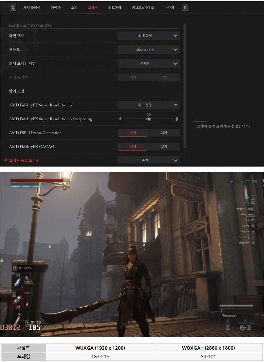 P의 거짓을 중간옵션에서 플레이 하고 있는 모습으로 FSR3 프레임 생성을 활성화 하면 프레임이 대폭 상승해 여유롭게 게임을 즐길 수 있다. (루나 & 에로우레이크를 탑재한 전작과는 분명한 성능차를 경험할 수 있을 것이다.)