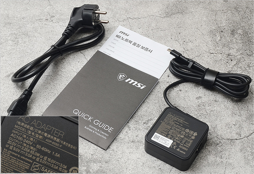 액세서리의 모습으로 65W 전원어댑터와 케이블을 비롯해 퀵 매뉴얼과 보증서 등을 지원한다. (전원 어댑터는 C타입에 다양한 전압을 지원해 스마트폰 충전용으로도 활용할 수 있다.)