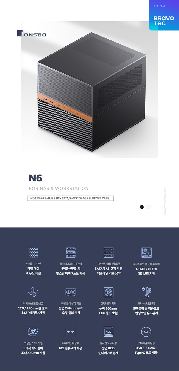 브라보텍에서 뛰어난 확장성과 효율적인 공간 설계를 갖춘 NAS 케이스 JONSBO N6 모델을 신규 출시한다.